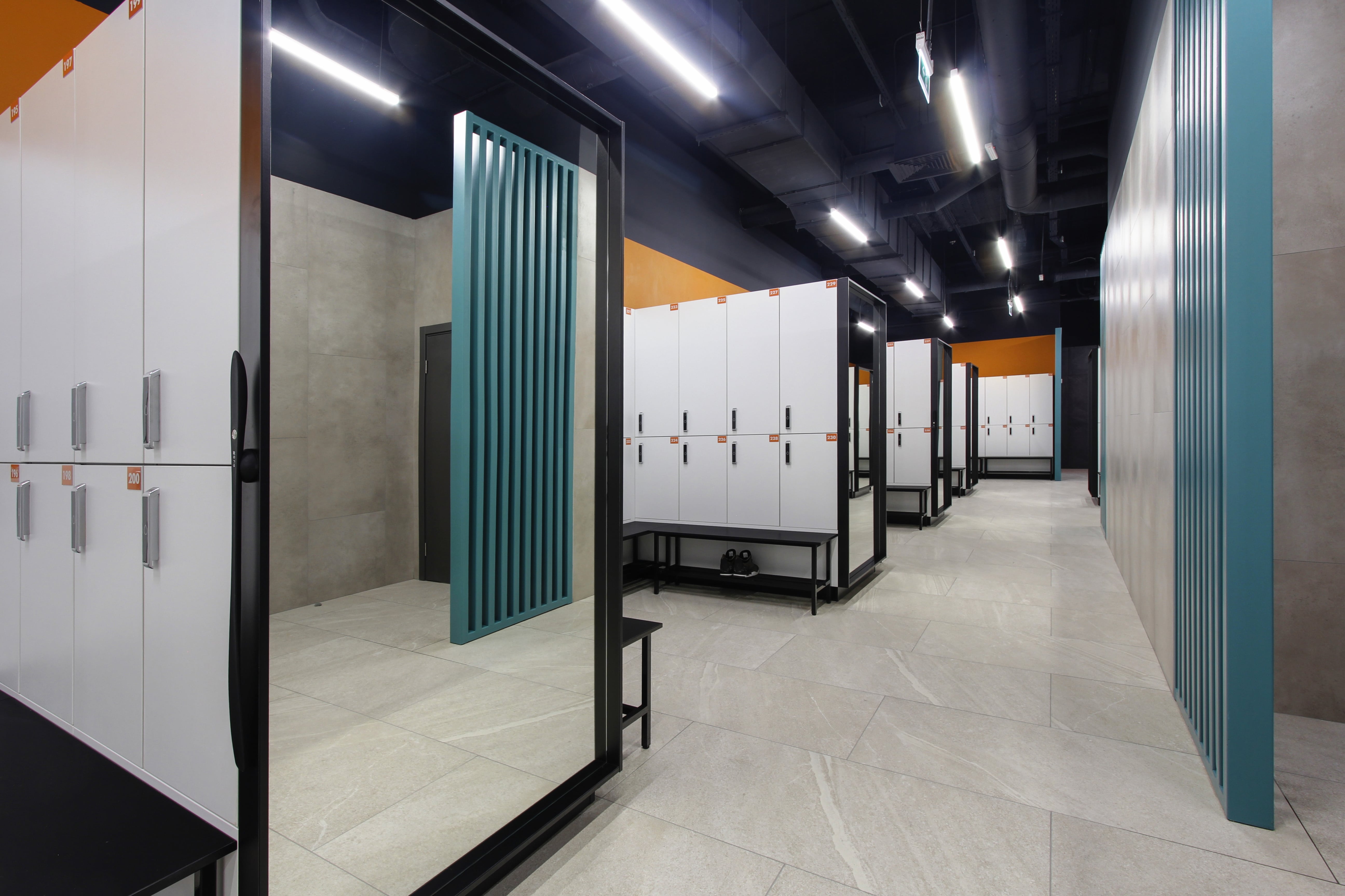 Шкафчики в раздевалках могут быть как до пола, так и на металлокаркасе с интегрированными скамьями. По желанию Заказчика мы можем интегрировать подсветку в верхний либо нижний горизонт шкафа.